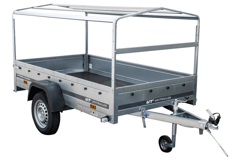Remorque automobile avec bâche haute, arceau et roue jockey. UNITRAILER Garden Trailer 230 KIPP est le dernier produit de notre offre. C'est la plus grande remorque dans notre magasin avec PTAC jusqu'à 750 kg. Elle est équipée de la ridelle arrière ouvrable, ce qui rend facile le chargement et le déchargement de la cargaison. Grâce au timon pliable, elle peut être placée verticalement sur le panneau arrière. Nous faisons toutes les formalités liées à l'achat pour vous. La remorque est livrée à votre domicile avec tous les documents nécessaires pour l'immatriculer.